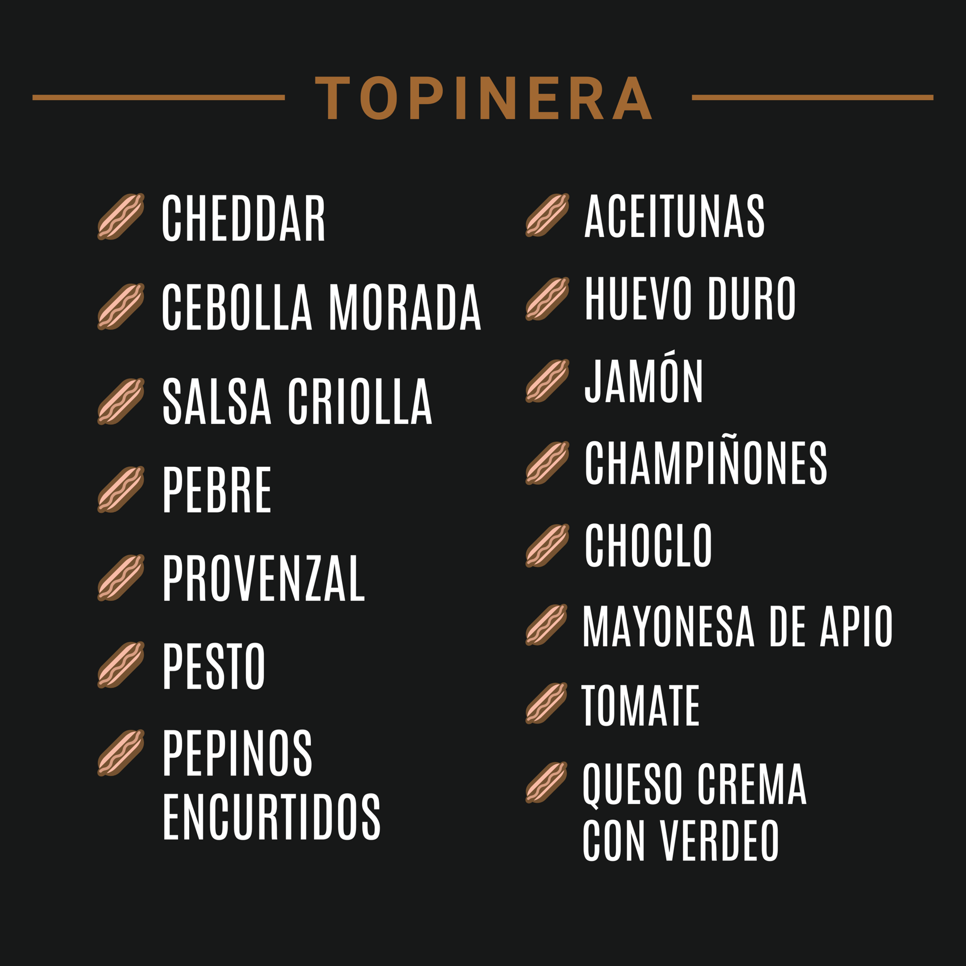 Con todos los toppings, salsas y aderezos que vos quieras.