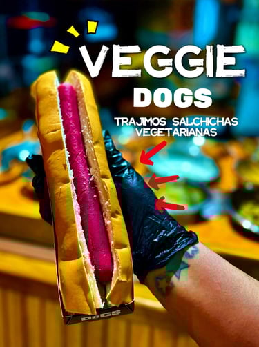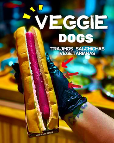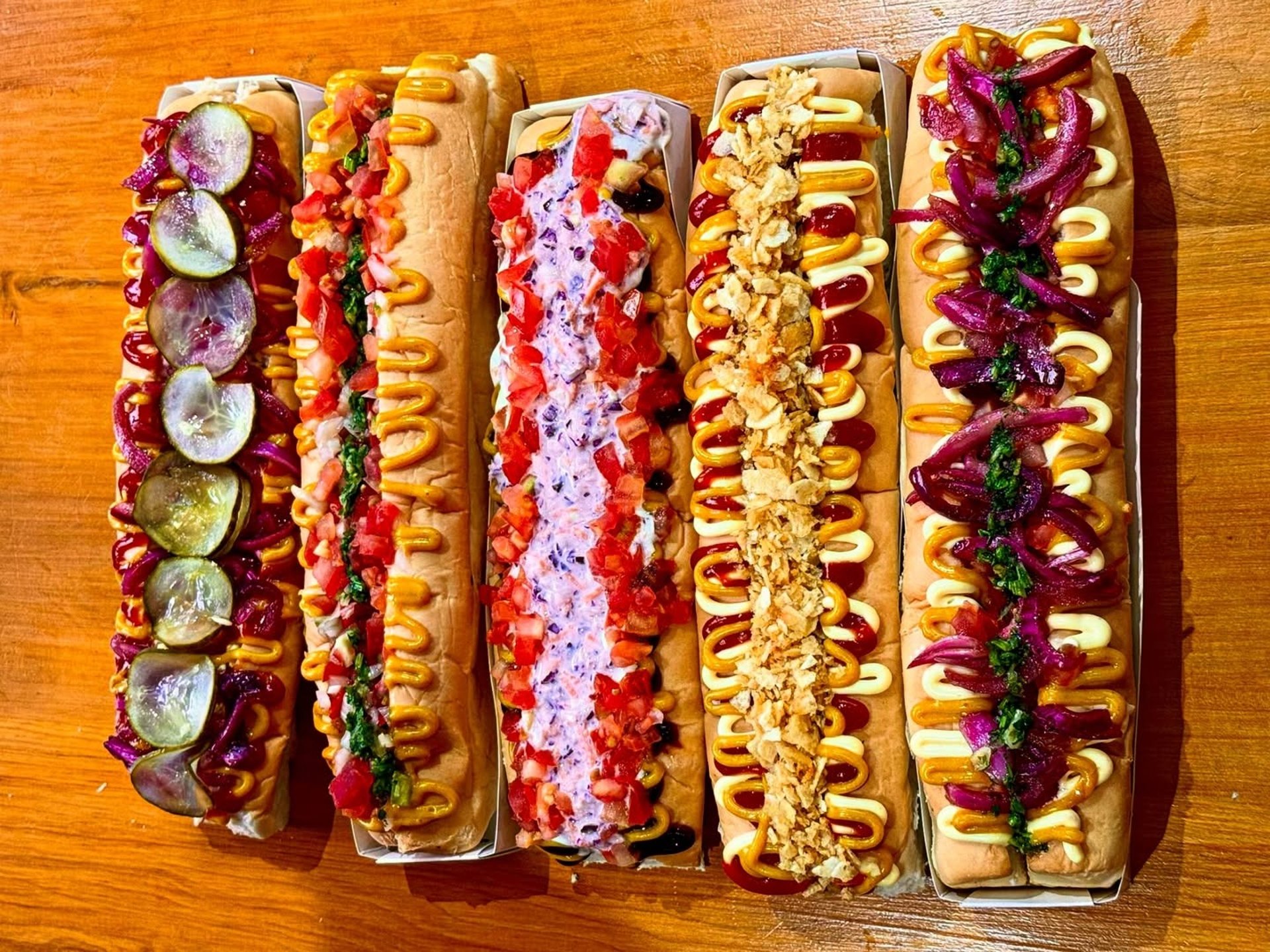 Salchicha vegana con todos los toppings, salsas y aderezos que vos quieras.