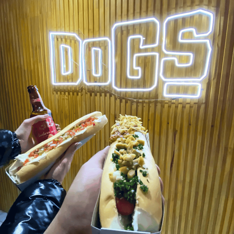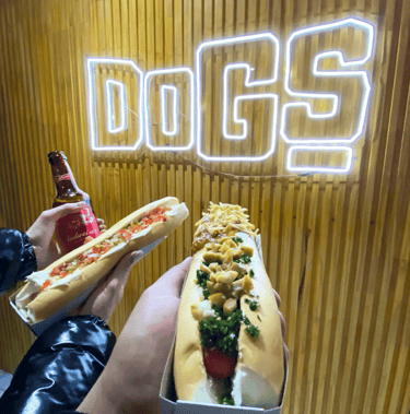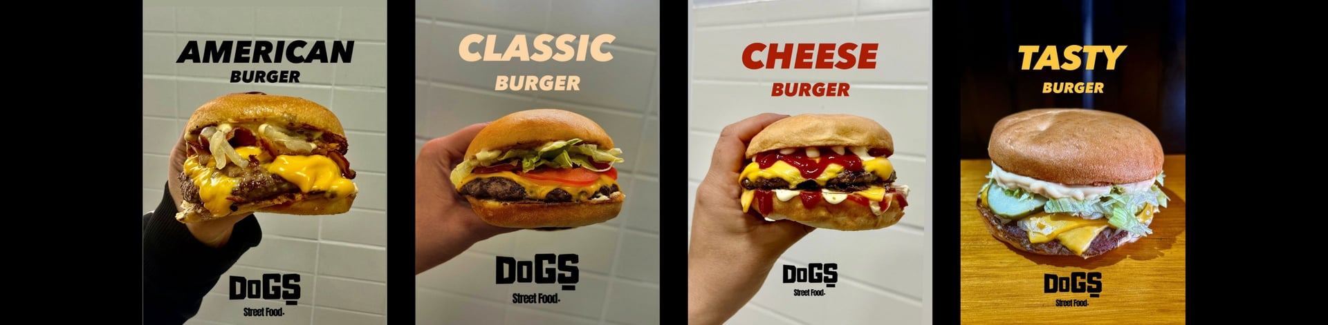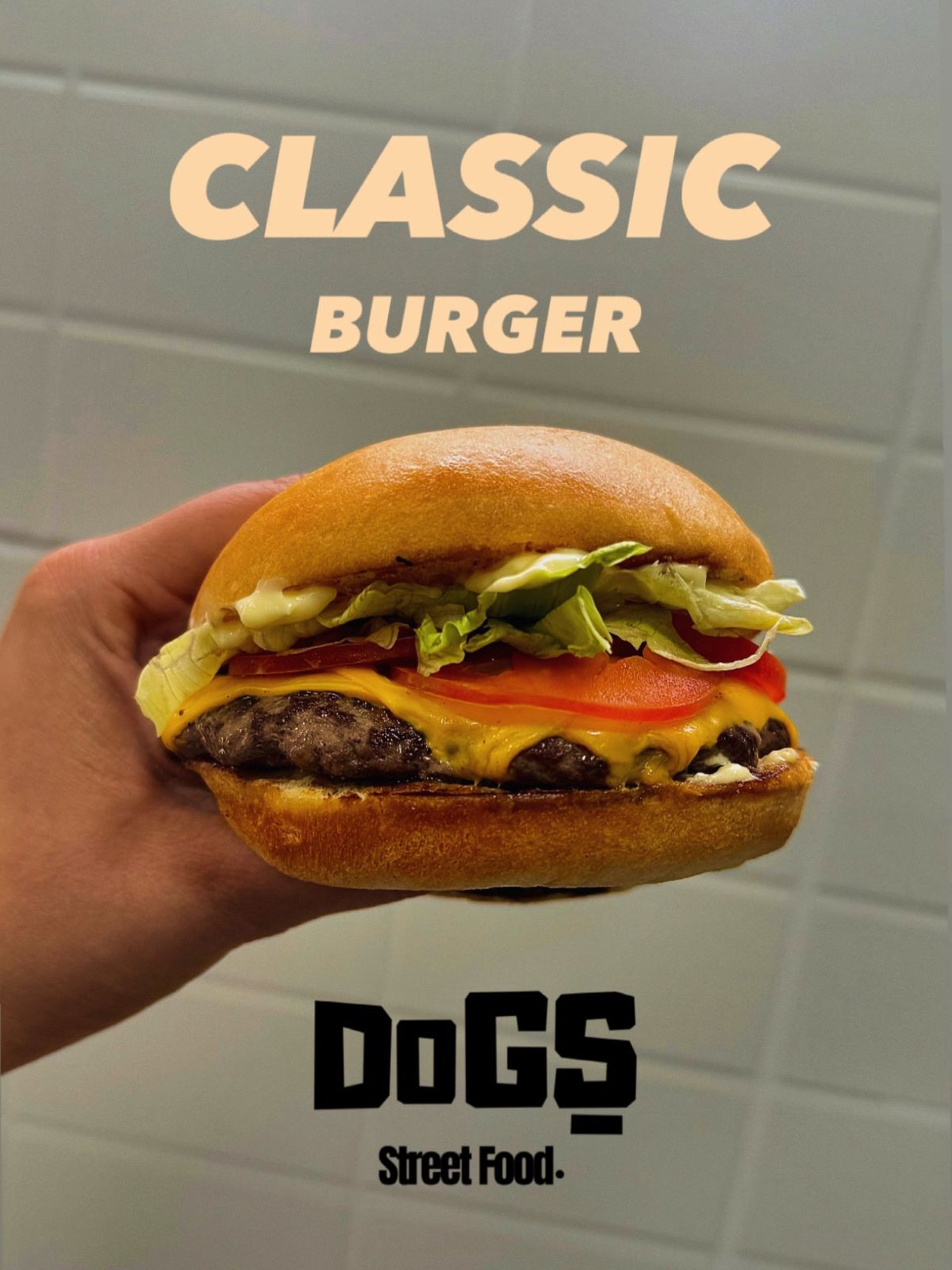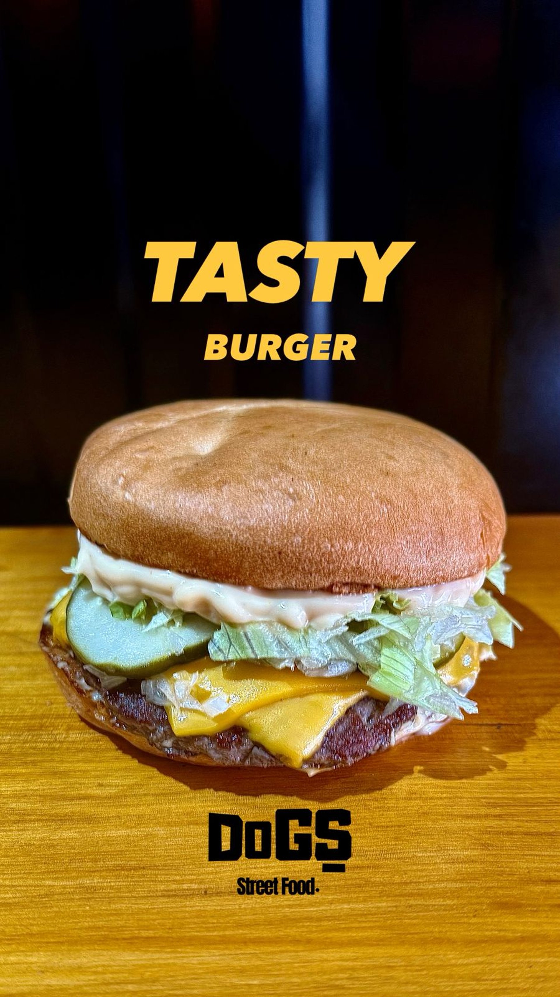 Medallón con chedar, salsa Dogs, cebolla, pepino y lechuga.